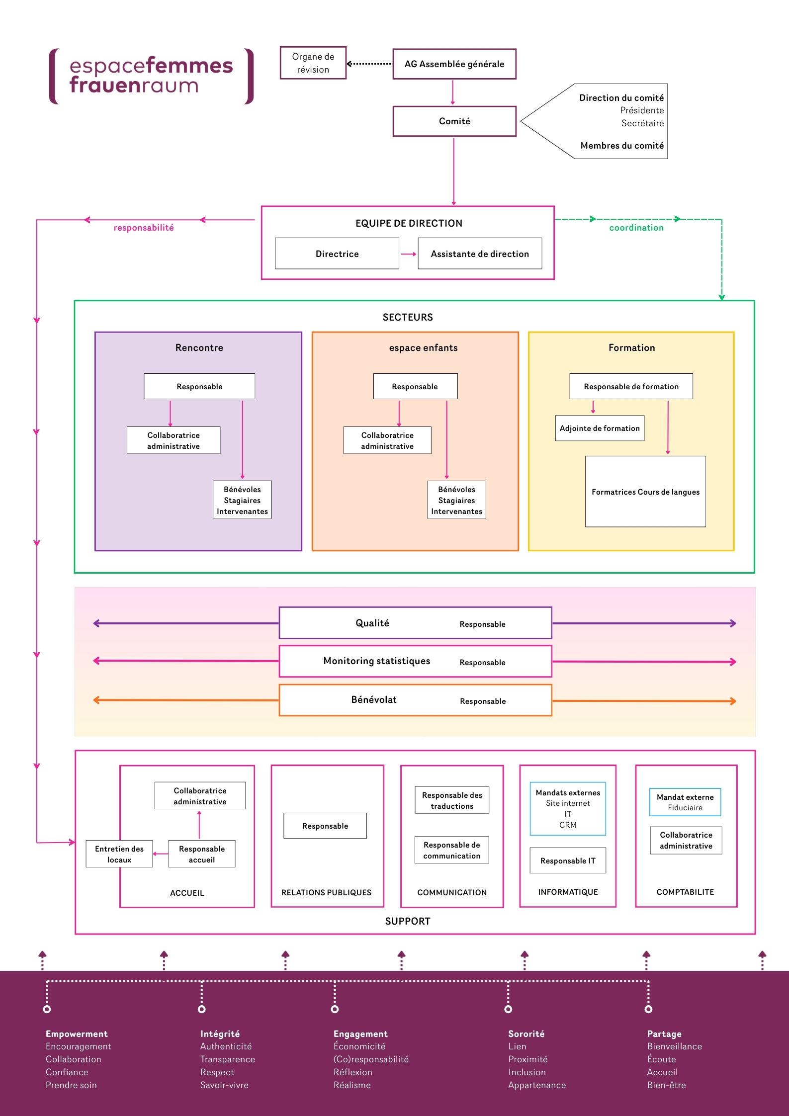 Le fonctionnement quotidien d’espacefemmes-frauenraum est assuré par une équipe de collaboratrices professionnelles et d’intervenantes externes, mandatées pour des tâches spécifiques.